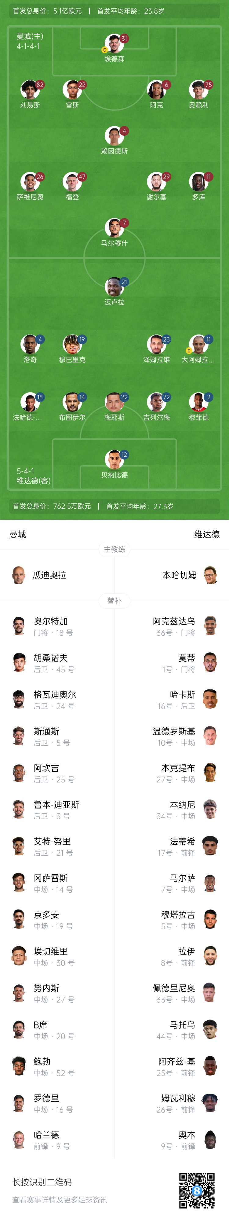 曼城替补:18-奥尔特加、3-迪亚斯、5-斯通斯、9-哈兰德、14-尼科-冈萨雷斯、16-罗德里、19-京多安、20-B席、21-艾特-努里、24-格瓦迪奥尔、25-阿坎吉、27-努内斯、30-埃切维里、45-胡桑诺夫、52-鲍勃