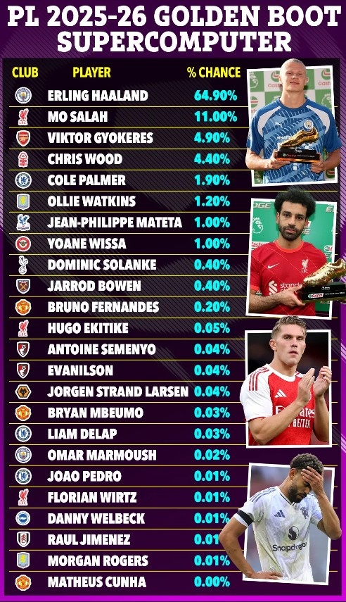 8月8日讯 根据《太阳报》报道,超算预测新赛季英超射手榜,哈兰德有64.9%的概率拿到金靴,萨拉赫11%第二。