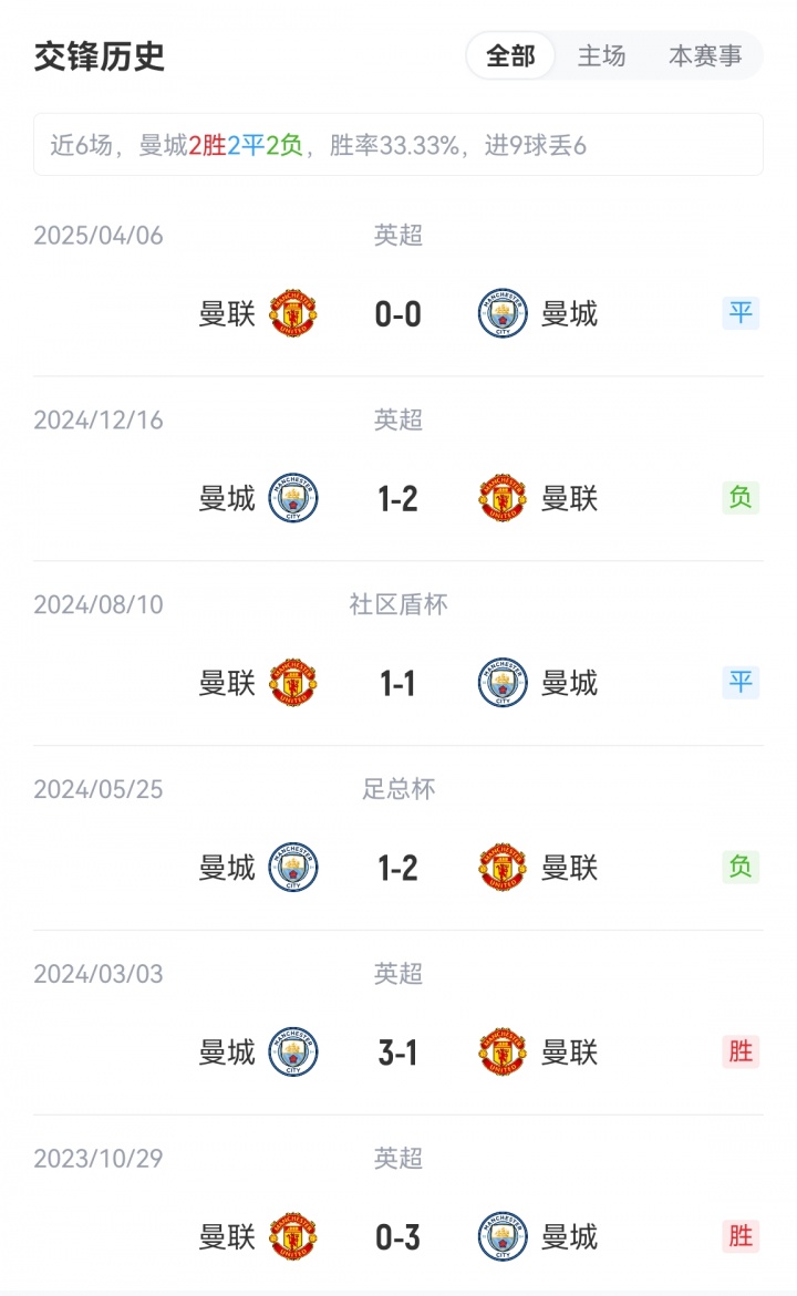 前三轮比赛曼城1胜2负,曼联1胜1平1负。