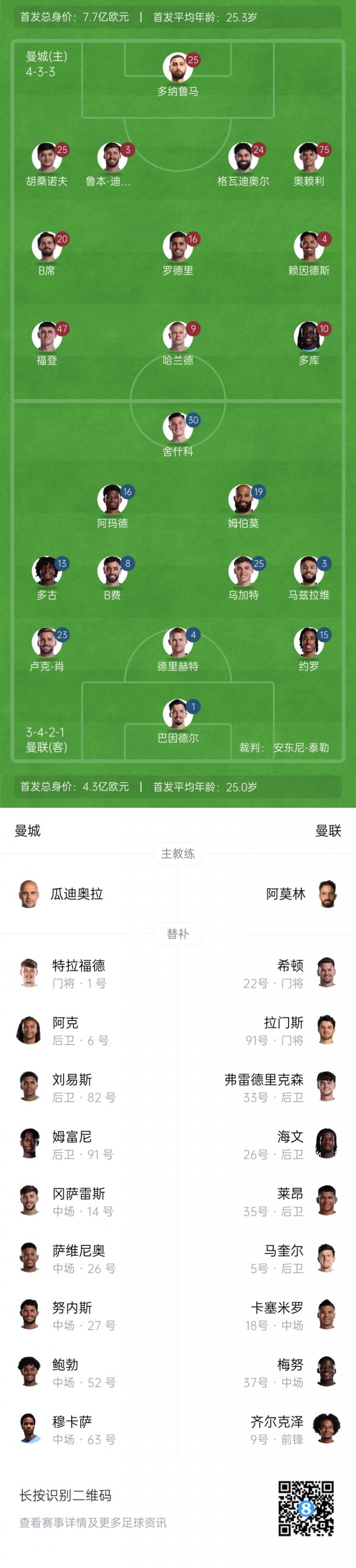 曼城首发:25-多纳鲁马、45-胡桑诺夫、3-鲁本-迪亚斯、24-格瓦迪奥尔、33-奥赖利、16-罗德里、20-B席、4-赖因德斯、47-福登、11-多库、9-哈兰德